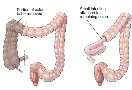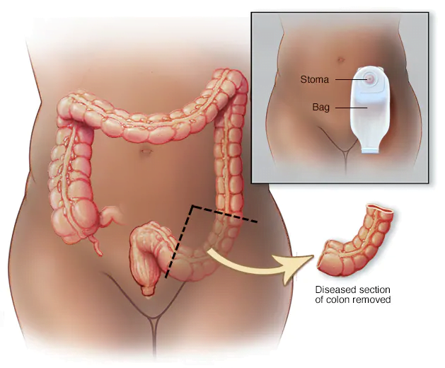 Conexión del colon con una abertura creada en el abdomen: Es posible que el cirujano conecte tu colon (colostomía) o intestino delgado (ileostomía) a una abertura creada en el abdomen (ostomía), esto permite que la materia fecal salgan del cuerpo a través de la misma. Deberás usar una bolsa por fuera del ostoma para recolectar las heces. Esto puede ser permanente o temporal.