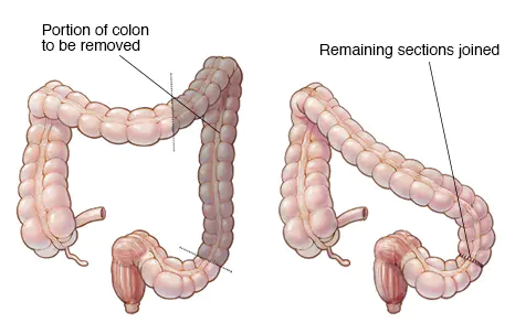 - Cáncer de colon: El cáncer en etapa temprana puede requerir que se extirpe solo una parte pequeña del colon durante la colectomía. El cáncer en etapa avanzada puede requerir que se extirpe una mayor parte del colon.